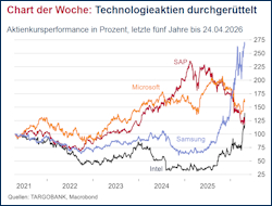 Angesichts der großen Bedeutung von Technologieaktien und der jüngsten Geschäftsberichte werfen wir in unserem Chart der Woche erneut einen Blick auf die Tech-Titel. Wir sehen nämlich eine Wachablösung bei den Gewinnern und Verlierern. Softwareunternehmen von Microsoft bis SAP wurden zuletzt abgestraft, während Hardwareentwickler und -hersteller wie Intel, Samsung und TSMC ein regelrechtes Kursfeuerwerk erleben.